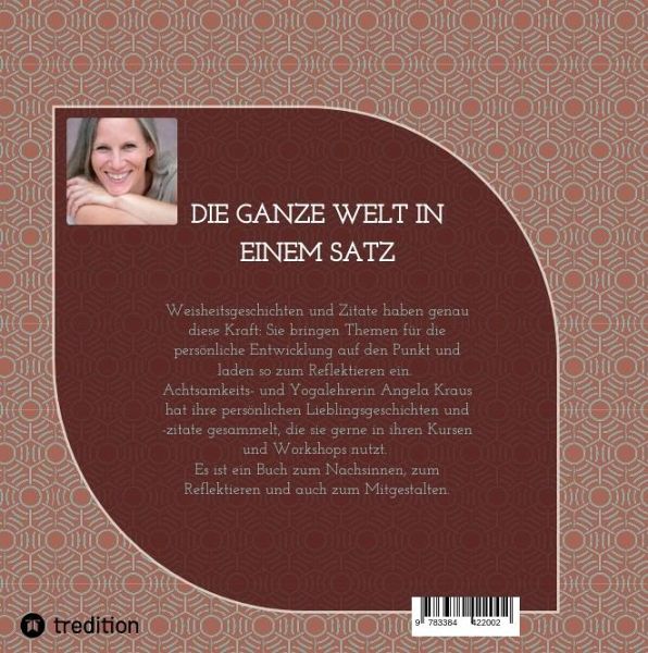 Die ganze Welt in einem Satz. Weisheitsgeschichten und Zitate haben genau diese Kraft: Sie bringen Themen für die persönliche Entwicklung auf den Punkt und laden so zum Reflektieren ein. Achtsamkeits- und Yogalehrerin Angela Kraus hat ihre persönlichen Lieblingsgeschichten und -zitate gesammelt, die sie gerne in ihren Kursen und Workshops nutzt. Es ist ein Buch zum Nachsinnen, zum Reflektieren und auch zum Mitgestalten.Im ersten Teil des Buches finden sich 30 ausgewählte Weisheitsgeschichten. Manche sind nur ein paar Sätze lang, andere mehrere Seiten. Die Geschichten sind teilweise mit Bleistiftzeichnungen (Marie Schwarzer) illustriert. Im zweiten Teil des Buches warten 30 ausgewählte Zitate auf die Leser_in. Hier kann persönlich mitgestaltet werden, da jedes Zitat für sich alleine steht und es jeweils einen extra Raum für eigene Gedanken gibt. Es kann auch etwas eingeklebt oder gezeichnet werden. So wird dieses kleine Buch zu einem ganz persönlichen Begleiter. Aufgeschlagen in einem Buchständer platziert stellt es eine liebevolle Erinnerung im Alltag dar.