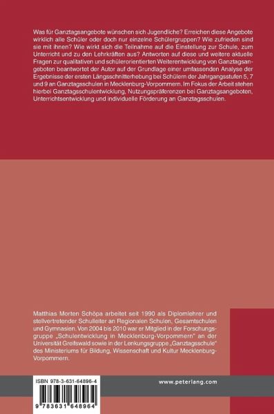 Was für Ganztagsangebote wünschen sich Jugendliche? Erreichen diese Angebote wirklich alle Schüler oder doch nur einzelne Schülergruppen? Wie zufrieden sind sie mit ihnen? Wie wirkt sich die Teilnahme auf die Einstellung zur Schule, zum Unterricht und zu den Lehrkräften aus? Antworten auf diese und weitere aktuelle Fragen zur qualitativen und schülerorientierten Weiterentwicklung von Ganztagsangeboten beantwortet der Autor auf der Grundlage einer umfassenden Analyse der Ergebnisse der ersten Längsschnitterhebung bei Schülern der Jahrgangsstufen 5, 7 und 9 an Ganztagsschulen in Mecklenburg-Vorpommern. Im Fokus der Arbeit stehen hierbei Ganztagsschulentwicklung, Nutzungspräferenzen bei Ganztagsangeboten, Unterrichtsentwicklung und individuelle Förderung an Ganztagsschulen.