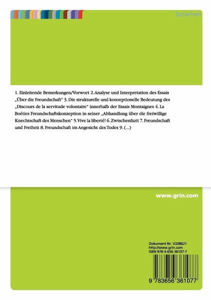Studienarbeit aus dem Jahr 2012 im Fachbereich Literaturwissenschaft - Vergleichende Literaturwissenschaft, Note: 2.0, Humboldt-Universität zu Berlin (Institut für Romanistik / Institut für Klassische Philologie), Veranstaltung: Montaigne und die Antike, Sprache: Deutsch, Abstract: 1. Einleitende Bemerkungen/Vorwort2. Analyse und Interpretation des Essais "Über die Freundschaft"3. Die strukturelle und konzeptionelle Bedeutung des "Discours de la servitude volontaire" innerhalb der Essais Montaignes4. La Boéties Freundschaftskonzeption in seiner "Abhandlung über die freiwillige Knechtschaft des Menschen"5. Vive la liberté!6. Zwischenfazit7. Freundschaft und Freiheit8. Freundschaft im Angesicht des Todes9. Freundschaftliche Kultivierung der Gesprächs- und Diskussionskunst10. Die Vorrede Montaignes im und als Zeichen der Freundschaft11. Abschließende Bemerkungen/Nachwort12. LiteraturverzeichnisAm Anfang war die Freundschaft. Diese These soll am Beginn vorliegender Arbeit stehen, diezwei Werke behandeln will, deren Anfangsimpuls eine geradezu idealtypische Freundschaft bildet und welche gleichzeitig diese zum Hauptthema und zur Grundidee selbiger Arbeit erhebt. Die Rede ist hierbei zum einen von den Essais des berühmten humanistischen Denkers und philosophischen Moralisten Michel de Montaigne (1533-1592) und zum zweiten dem Discours de la servitude volontaire des umfassend humanistisch gebildeten Parlamentariers und Gerichtsrats Étienne de La Boétie (1530-1563). Montaigne und La Boétie verband Zeit ihres Lebens eine enge, ja geradezu "vollkommene Freundschaft" , wie Montaigne es in seinen Essais formuliert. Im Zuge der Analyse und Interpretation des 28. Kapitels aus dem Ersten Buch der Essais "De l'amitié", die zugleich den ersten wichtigen Teil dieser Arbeit einnehmen wird, werden wir ausführlich und eindrücklich die Bedeutung und Besonderheit dieser Freundschaft kennenlernen. In einem zweiten Schritt soll dann der Diskurs von La Boétie besprochen und im Hinblick auf unsere Eingangsthese diskutiert werden. Die Arbeit versucht in diesem Konnex zu zeigen, welch spezifischen und gewichtigen Einfluss La Boétie und seine Werke, insbesondere der "Discours de la servitude volontaire" und seine darin entwickelte Freiheitskonzeption "für die Entstehung und die besondere Formgebung" der Essais hatte. Es sollen hierbei also auch intertextuelle Bezüge im Oeuvre dieser beiden großen Gelehrten aufgezeigt werden, die für das Verständnis und die Rezeption unabdingbar sind, da deren Werke vollständig "aufeinander bezogen" sind. Denn es ist meines Erachtens als Tatsache anzusehen, dass man nicht über Montaigne nachdenken, reden oder schreiben kann, ohne dass der Name La Boétie zur Sprache kommt, was umgekehrt genauso gilt.