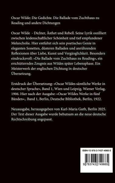 Oscar Wilde: Die Gedichte. Die Ballade vom Zuchthaus zu Reading und andere Dichtungen Oscar Wilde - Dichter, Ästhet und Rebell. Seine Lyrik oszilliert zwischen leidenschaftlicher Schönheit und tief empfundener Melancholie. Hier entfaltet sich sein poetisches Genie in eleganten Sonetten, düsteren Balladen und anrührenden Reflexionen über Liebe, Kunst und Vergänglichkeit. Besonders eindrucksvoll: »Die Ballade vom Zuchthaus zu Reading«, ein erschütterndes Zeugnis aus Wildes später Lebensphase. Ein Meisterwerk der englischen Dichtung in deutscher Übersetzung. Erstdruck der Übersetzung: »Oscar Wildes sämtliche Werke in deutscher Sprache«, Band 1, Wien und Leipzig, Wiener Verlag, 1906. Hier nach der Ausgabe: »Oscar Wildes Werke in fünf Bänden«,. Band 1, Berlin, Deutsche Bibliothek, Berlin, 1922. Neuausgabe, herausgegeben von Karl-Maria Guth, Berlin 2025. Der Text dieser Ausgabe wurde behutsam an die neue deutsche Rechtschreibung angepasst. Gesetzt aus der Minion Pro, 11 pt. Henricus - Edition Deutsche Klassik GmbH Über den Autor: 1854 in Dublin als zweites von drei Kindern eines bekannten Augenarztes und einer Schriftstellerin geboren, lässt sich Oscar Fingal O'Flahertie Wills Wilde nach dem Literaturstudium in Dublin und Oxford in London nieder. Der schlagfertig humorvolle Freimaurer entwickelt sich zu einem berühmt berüchtigten Skandalautor, genießt seinen schlechten Ruf als Dandy und pflegt einen extravaganten Auftritt in samtenen Kniebundhosen mit Seidenstrümpfen. Er wird gehässig karikiert und zugleich für seine Bonmots gefeiert. 30-jährig heiratet der inzwischen weltberühmte Dichter die wohlhabende und bildschöne Kinderautorin Constance Mary Loyd, mit der er zwei Söhne haben wird. 1895 zettelt der Vater seines langjährigen Liebhabers Lord Alfred Douglas einen Prozess wegen der damals schwer bestraften Homosexualität gegen ihn an, der ihn für zwei Jahre ins Zuchthaus bringt. Die menschenverachtenden Haftbedingungen in Isolation und Dunkelheit mit harter Zwangsarbeit ruinieren seine Gesundheit. Nach seiner Entlassung lebt er verarmt, vereinsamt und krank in Paris. Am 30. November 1900 stirbt mit Oscar Wilde ein charismatischer Repräsentant der Dekadenz und eine der schillerndsten Figuren des viktorianischen Englands. 1917 schreibt Alfred Kerr über Oscar Wilde »Seine langsame Hinrichtung bleibt der letzte Akt des Mittelalters.«