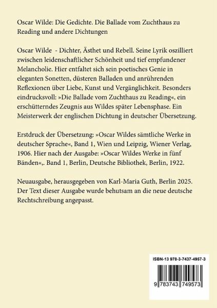 Oscar Wilde: Die Gedichte. Die Ballade vom Zuchthaus zu Reading und andere Dichtungen Oscar Wilde - Dichter, Ästhet und Rebell. Seine Lyrik oszilliert zwischen leidenschaftlicher Schönheit und tief empfundener Melancholie. Hier entfaltet sich sein poetisches Genie in eleganten Sonetten, düsteren Balladen und anrührenden Reflexionen über Liebe, Kunst und Vergänglichkeit. Besonders eindrucksvoll: »Die Ballade vom Zuchthaus zu Reading«, ein erschütterndes Zeugnis aus Wildes später Lebensphase. Ein Meisterwerk der englischen Dichtung in deutscher Übersetzung. Erstdruck der Übersetzung: »Oscar Wildes sämtliche Werke in deutscher Sprache«, Band 1, Wien und Leipzig, Wiener Verlag, 1906. Hier nach der Ausgabe: »Oscar Wildes Werke in fünf Bänden«,. Band 1, Berlin, Deutsche Bibliothek, Berlin, 1922. Neuausgabe, herausgegeben von Karl-Maria Guth, Berlin 2025. Der Text dieser Ausgabe wurde behutsam an die neue deutsche Rechtschreibung angepasst. Gesetzt aus der Minion Pro, 11 pt. Henricus - Edition Deutsche Klassik GmbH Über den Autor: 1854 in Dublin als zweites von drei Kindern eines bekannten Augenarztes und einer Schriftstellerin geboren, lässt sich Oscar Fingal O'Flahertie Wills Wilde nach dem Literaturstudium in Dublin und Oxford in London nieder. Der schlagfertig humorvolle Freimaurer entwickelt sich zu einem berühmt berüchtigten Skandalautor, genießt seinen schlechten Ruf als Dandy und pflegt einen extravaganten Auftritt in samtenen Kniebundhosen mit Seidenstrümpfen. Er wird gehässig karikiert und zugleich für seine Bonmots gefeiert. 30-jährig heiratet der inzwischen weltberühmte Dichter die wohlhabende und bildschöne Kinderautorin Constance Mary Loyd, mit der er zwei Söhne haben wird. 1895 zettelt der Vater seines langjährigen Liebhabers Lord Alfred Douglas einen Prozess wegen der damals schwer bestraften Homosexualität gegen ihn an, der ihn für zwei Jahre ins Zuchthaus bringt. Die menschenverachtenden Haftbedingungen in Isolation und Dunkelheit mit harter Zwangsarbeit ruinieren seine Gesundheit. Nach seiner Entlassung lebt er verarmt, vereinsamt und krank in Paris. Am 30. November 1900 stirbt mit Oscar Wilde ein charismatischer Repräsentant der Dekadenz und eine der schillerndsten Figuren des viktorianischen Englands. 1917 schreibt Alfred Kerr über Oscar Wilde »Seine langsame Hinrichtung bleibt der letzte Akt des Mittelalters.«