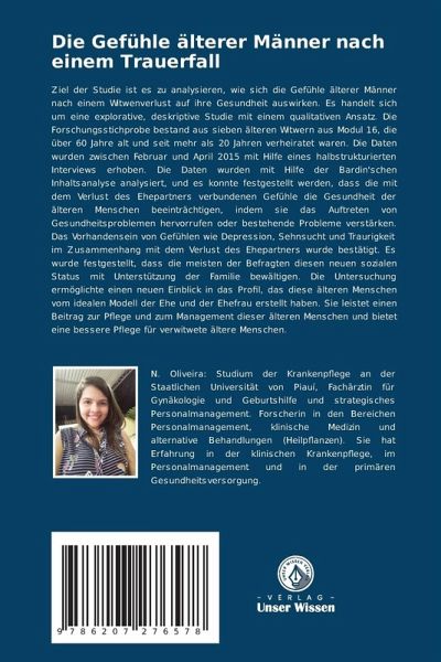 Ziel der Studie ist es zu analysieren, wie sich die Gefühle älterer Männer nach einem Witwenverlust auf ihre Gesundheit auswirken. Es handelt sich um eine explorative, deskriptive Studie mit einem qualitativen Ansatz. Die Forschungsstichprobe bestand aus sieben älteren Witwern aus Modul 16, die über 60 Jahre alt und seit mehr als 20 Jahren verheiratet waren. Die Daten wurden zwischen Februar und April 2015 mit Hilfe eines halbstrukturierten Interviews erhoben. Die Daten wurden mit Hilfe der Bardin'schen Inhaltsanalyse analysiert, und es konnte festgestellt werden, dass die mit dem Verlust des Ehepartners verbundenen Gefühle die Gesundheit der älteren Menschen beeinträchtigen, indem sie das Auftreten von Gesundheitsproblemen hervorrufen oder bestehende Probleme verstärken. Das Vorhandensein von Gefühlen wie Depression, Sehnsucht und Traurigkeit im Zusammenhang mit dem Verlust des Ehepartners wurde bestätigt. Es wurde festgestellt, dass die meisten der Befragten diesen neuen sozialen Status mit Unterstützung der Familie bewältigen. Die Untersuchung ermöglichte einen neuen Einblick in das Profil, das diese älteren Menschen vom idealen Modell der Ehe und der Ehefrau erstellt haben. Sie leistet einen Beitrag zur Pflege und zum Management dieser älteren Menschen und bietet eine bessere Pflege für verwitwete ältere Menschen.