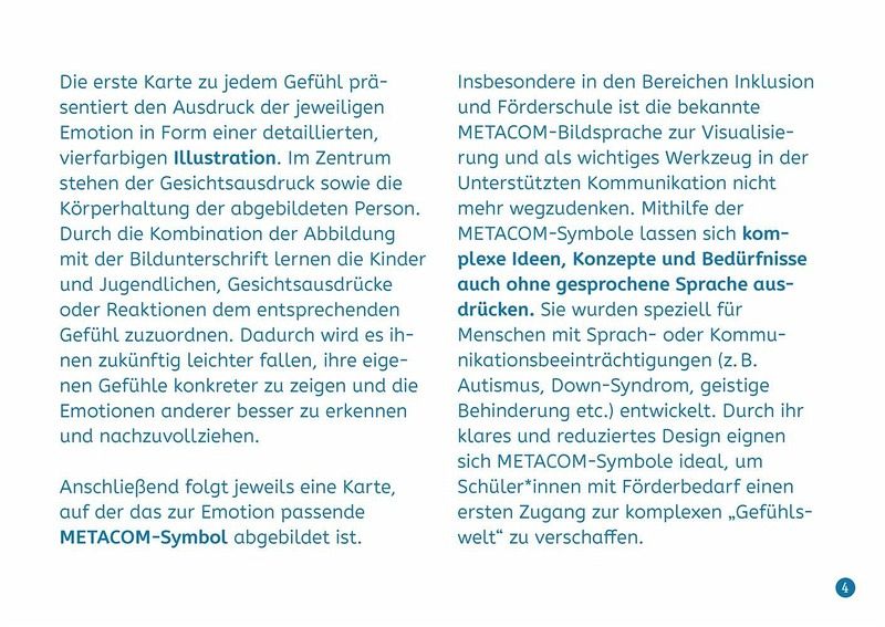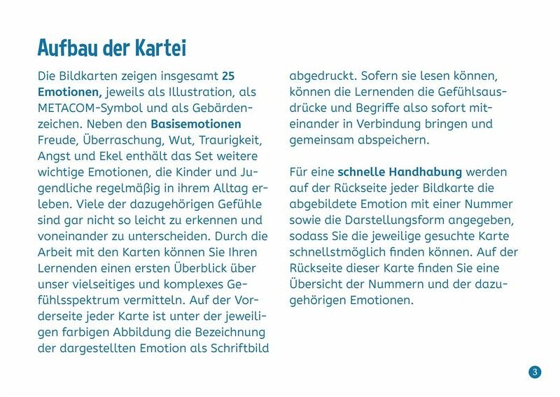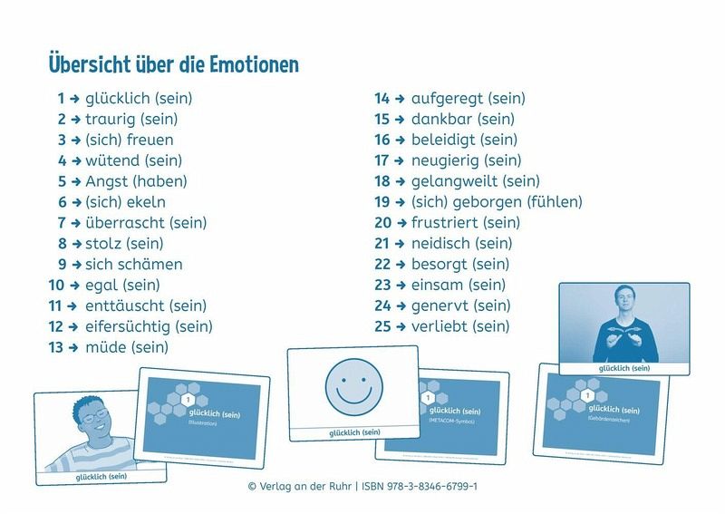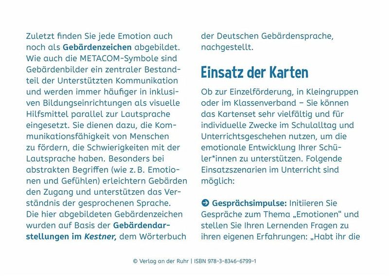 Bildkarten für Sonderpädagogen und Sonderpädagoginnen/Lehrer und Lehrerinnen an Förderschulen und (inklusiven) Grund- und weiterführenden Schulen, Klasse 1-10 +++Sie möchten Ihre heterogene Klasse bei der Entwicklung ihrer emotionalen Kompetenz unterstützen und dabei Elemente der Unterstützten Kommunikation einbinden? Dann ist dieses Kartenset mit Bildkarten zum Thema "Gefühle" speziell für die sonderpädagogische Förderung genau das Richtige für Sie!Auf den farbigen Bildkarten werden insgesamt 25 Emotionen jeweils als Illustration, als METACOM-Symbol und als Gebärdenzeichen abgebildet. Neben den Basisemotionen enthält das Set die wichtigsten positiven und negativen Gefühle, die Kinder und Jugendliche in ihrem Alltag regelmäßig erleben, sowie Infokarten mit Hintergrundwissen und Anwendungsmöglichkeiten. Ob in der Förderschule, im inklusiven Unterricht oder als therapeutisches Material - die Bildkarten sind vielseitig und spontan einsetzbar.So lernen Ihre Schüler und Schülerinnen nicht nur, Gefühle bei sich und anderen besser wahrzunehmen und richtig zu benennen, sondern verbessern auch ihr Empathievermögen und ihre Sozialkompetenz.