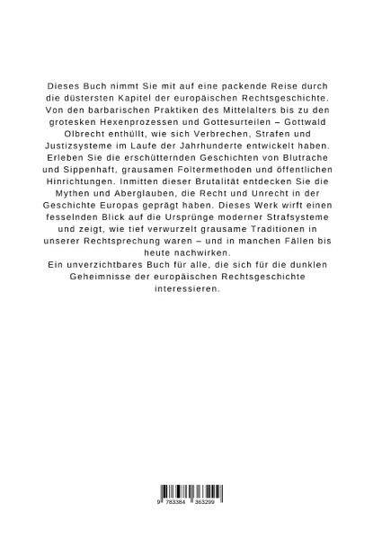 Dieses Buch nimmt Sie mit auf eine packende Reise durch die düstersten Kapitel der europäischen Rechtsgeschichte. Von den barbarischen Praktiken des Mittelalters bis zu den grotesken Hexenprozessen und Gottesurteilen - Gottwald Olbrecht enthüllt, wie sich Verbrechen, Strafen und Justizsysteme im Laufe der Jahrhunderte entwickelt haben.Erleben Sie die erschütternden Geschichten von Blutrache und Sippenhaft, grausamen Foltermethoden und öffentlichen Hinrichtungen. Inmitten dieser Brutalität entdecken Sie die Mythen und Aberglauben, die Recht und Unrecht in der Geschichte Europas geprägt haben. Dieses Werk wirft einen fesselnden Blick auf die Ursprünge moderner Strafsysteme und zeigt, wie tief verwurzelt grausame Traditionen in unserer Rechtsprechung waren - und in manchen Fällen bis heute nachwirken.Ein unverzichtbares Buch für alle, die sich für die dunklen Geheimnisse der europäischen Rechtsgeschichte interessieren.