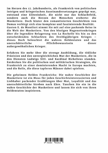 Im Herzen des 17. Jahrhunderts, als Frankreich von politischen Intrigen und kriegerischen Auseinandersetzungen geprägt war, entstand eine Eliteeinheit, die nicht nur das Schlachtfeld, sondern auch die Herzen der Menschen eroberte: die Musketiere. Doch hinter den romantisierten Geschichten von Dumas verbirgt sich eine komplexe und faszinierende Realität.Gaston E. de Montfort nimmt Sie mit auf eine packende Reise in die Welt der Musketiere. Von den blutigen Hugenottenkriegen über die legendäre Belagerung von La Rochelle bis hin zu den entscheidenden Schlachten des Dreißigjährigen Krieges - dieses Buch beleuchtet die wahren Heldentaten und das unerschütterliche Pflichtbewusstsein dieser außergewöhnlichen Krieger.Erfahren Sie mehr über die strenge Ausbildung, die tödliche Präzision und den unvergleichlichen Mut der Musketiere, die in den Diensten Ludwigs XIII. und Kardinal Richelieus standen. Entdecken Sie die politischen und militärischen Strategien, die Frankreich zu einer dominierenden Macht in Europa machten, und die Rolle, die diese tapferen Männer dabei spielten.Die geheimen Helden Frankreichs: Die wahre Geschichte der Musketiere ist ein Muss für jeden Geschichtsinteressierten und Liebhaber packender Erzählungen über Mut, Loyalität und das unerschütterliche Streben nach Ehre. Tauchen Sie ein in die wahre Geschichte der Musketiere und lassen Sie sich von ihren Heldentaten inspirieren.