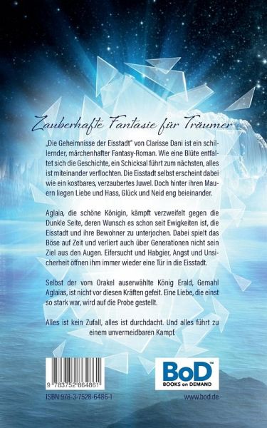 Zauberhafte Fantasie für Träumer"Die Geheimnisse der Eisstadt" von Clarisse Dani ist ein schillernder, märchenhafter Fantasy-Roman. Wie eine Blüte entfaltet sich die Geschichte, ein Schicksal führt zum nächsten, alles ist miteinander verflochten. Die Eisstadt selbst erscheint dabei wie ein kostbares, verzaubertes Juwel. Doch hinter ihren Mauern liegen Liebe und Hass, Glück und Neid eng beieinander.Aglaia, die schöne Königin, kämpft verzweifelt gegen die Dunkle Seite, deren Wunsch es schon seit Ewigkeiten ist, die Eisstadt und ihre Bewohner zu unterjochen. Dabei spielt das Böse auf Zeit und verliert auch über Generationen nicht sein Ziel aus den Augen. Eifersucht und Habgier, Angst und Unsicherheit öffnen ihm immer wieder eine Tür in die Eisstadt.Selbst der vom Orakel auserwählte König Erald, Gemahl Aglaias, ist nicht vor diesen Kräften gefeit. Eine Liebe, die einst so stark war, wird auf die Probe gestellt. Alles ist kein Zufall, alles ist durchdacht. Und alles führt zu einem unvermeidbaren Kampf.