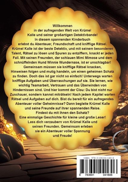 Magie, Spannung und ein tierischer Detektiv mit Spürsinn - willkommen im zweiten Fall der Keksbande!Du hast ein Kind, das Rätsel liebt, gerne lacht und sich mit tierischen Helden identifiziert? Dann ist "Krümel Kalle und der magische Spiegel" genau das richtige Buch!Krümel Kalle, der kluge Mäusedetektiv, ist zurück - und diesmal wird es magisch. Ein wertvoller Spiegel verschwindet aus der Werkstatt von Riecher Rainer. Doch dieser Spiegel ist kein gewöhnlicher - er trägt ein Geheimnis in sich! Zusammen mit seinen Freunden Mimi Mimose und Winnie Wundernase folgt Kalle der Spur durch dunkle Höhlen, knifflige Rätsel und mysteriöse Begegnungen. Die Leserinnen und Leser werden selbst zu Detektiven: Mitdenken, miträtseln, mitlachen - das steht bei diesem Abenteuer im Mittelpunkt.Für wen ist das Buch perfekt?Kinder ab 6 Jahren (auch toll zum Vorlesen für jüngere Spürnasen)Eltern, die Vorlesen mit Köpfchen liebenGroßeltern, die Freude schenken wollenAlle, die Bücher suchen, die nicht nur unterhalten, sondern auch mitraten lassenKinder, die Tiere, Abenteuer und kleine Heldengeschichten liebenOb zum Selberlesen oder gemeinsamen Schmökern - dieses Buch sorgt für Spannung, Lacher und schöne Momente.Bereit für das nächste Abenteuer? Dann schnapp dir dein Exemplar von "Krümel Kalle und der magische Spiegel" - und löse den Fall gemeinsam mit Kalle und der Keksbande!
