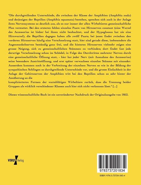 "Die durchgreifenden Unterschiede, die zwischen der Klasse der Amphibien (Amphibia nuda) und derjenigen der Reptilien (Amphibia squamata) bestehen, sprechen sich auch in der Anlage ihres Nervensystems so deutlich aus, als es nur immer der allen Wirbeltieren gemeinschaftliche Plan verstattet. Bei den ersteren fehlen einzelne Paare von Hirnnerven constant (eine Wurzel des Accessorius ist bisher bei ihnen nicht beobachtet, und der Hypoglossus hat nie eine Hirnwurzel), die Reptilien dagegen haben alle zwölf Paare; bei jenen findet zwischen den vorderen Hirnnerven häufig eine Verschmelzung statt, hier sind gerade diese, insbesondere die Augenmuskelnerven beständig ganz frei, und die hinteren Hirnnerven vielmehr zeigen eine grosse Neigung, sich zu gemeinschaftlichen Stämmen zu verbinden; dort findet fast jede derartige Verschmelzung schon im Schädel, in Folge des Durchtrittes mehrerer Nerven durch eine gemeinschaftliche Öffnung statt, - hier hat jeder Nerv (mit Ausnahme des Accessorius) seine besondere Austrittsöffnung, und erst später verwachsen einzelne Stämme mit einander. Ausserdem kommen noch in der Verbreitung der einzelnen Nerven so wie in der Bildung der sympathischen Schlingen so durchgreifende Unterschiede vor, und die grosse Einfachheit in der Anlage der Gehirnnerven der Amphibien tritt bei den Reptilien schon so sehr hinter der Annäherung an die