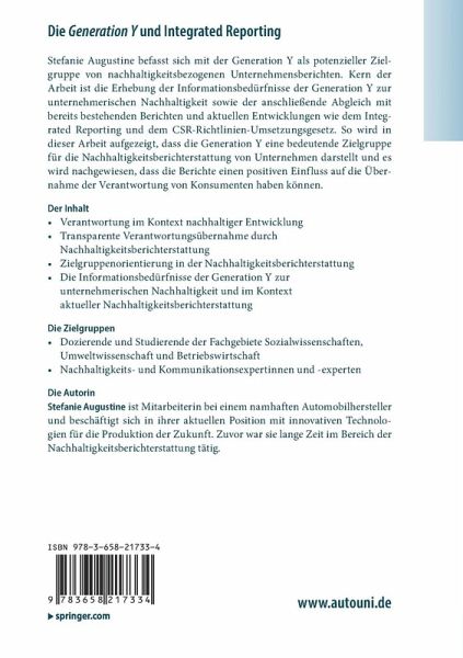 Stefanie Augustine befasst sich mit der Generation Y als potenzieller Zielgruppe von nachhaltigkeitsbezogenen Unternehmensberichten. Kern der Arbeit ist die Erhebung der Informationsbedürfnisse der Generation Y zur unternehmerischen Nachhaltigkeit sowie der anschließende Abgleich mit bereits bestehenden Berichten und aktuellen Entwicklungen wie dem Integrated Reporting und dem CSR-Richtlinien-Umsetzungsgesetz. So wird in dieser Arbeit aufgezeigt, dass die Generation Y eine bedeutende Zielgruppe für die Nachhaltigkeitsberichterstattung von Unternehmen darstellt und es wird nachgewiesen, dass die Berichte einen positiven Einfluss auf die Übernahme der Verantwortung von Konsumenten haben können.