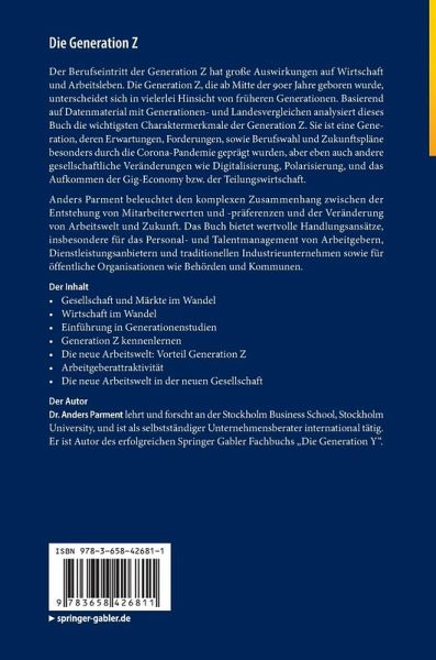 Der Berufseintritt der Generation Z hat große Auswirkungen auf Wirtschaft und Arbeitsleben. Die Generation Z, die ab Mitte der 90er Jahre geboren wurde, unterscheidet sich in vielerlei Hinsicht von früheren Generationen. Basierend auf Datenmaterial mit Generationen- und Landesvergleichen analysiert dieses Buch die wichtigsten Charaktermerkmale der Generation Z. Eine Generation deren Erwartungen, Forderungen, sowie Berufswahl und Zukunftspläne besonders durch die Corona-Pandemie geprägt wurden, aber eben auch andere gesellschaftliche Veränderungen wie Digitalisierung, Polarisierung, und das Aufkommen der Gig-Economy bzw. der Teilungswirtschaft.