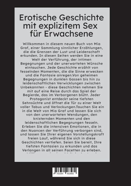 Willkommen in diesem neuen Buch von Mia Graf, einer Sammlung sinnlicher Erzählungen, die die Grenzen der Lust und Leidenschaft erkunden. In diesen Seiten werden Sie in eine Welt der Verführung, der intimen Begegnungen und der unerwarteten Wünsche eintauchen. Jede Geschichte erzählt von fesselnden Momenten, die die Sinne erwecken und die Fantasie anregen.Von geheimen Begegnungen in dunklen Gassen bis hin zu leidenschaftlichen Verwicklungen zwischen Unbekannten - diese Geschichten nehmen Sie mit auf eine Reise durch das Spiel der Begierde, das im Verborgenen blüht. Jeder Protagonist entdeckt seine tiefsten Sehnsüchte und öffnet die Tür zu einer Welt voller Tabus und Verlockungen.Das Buch enthält freizügige sexuelle Inhalte und ist nicht für Jugendliche unter 18 Jahren geeignet. Die Geschichten sind reine Fantasie: Die Charaktere sind alle volljährig und, wie der Inhalt, fiktiv.Tauchen Sie ein in die Welt von Mia Graf und lassen Sie sich von den unerwarteten Wendungen, den knisternden Momenten und den leidenschaftlichen Begegnungen fesseln. Erleben Sie die intensiven Emotionen, die in den Nuancen der Verführung verborgen sind, und lassen Sie Ihrer eigenen Vorstellungskraft freien Lauf, während Sie sich in diese Geschichten vertiefen. Seien Sie bereit, Ihre tiefsten Fantasien zu erkunden und das Verlangen in all seinen Facetten zu erleben. Willkommen in einer Welt der Lust und Leidenschaft!