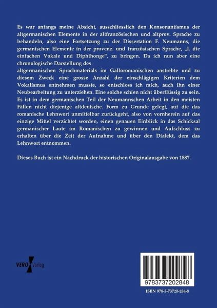 Es war anfangs meine Absicht, ausschliesslich den Konsonantismus der altgermanischen Elemente in der altfranzösischen und altprov. Sprache zu behandeln, also eine Fortsetzung zu der Dissertation F. Neumanns, die germanischen Elemente in der provenz. und französischen Sprache, I. die einfachen Vokale und Diphthonge", zu bringen. Da ich nun aber eine chronologische Darstellung des