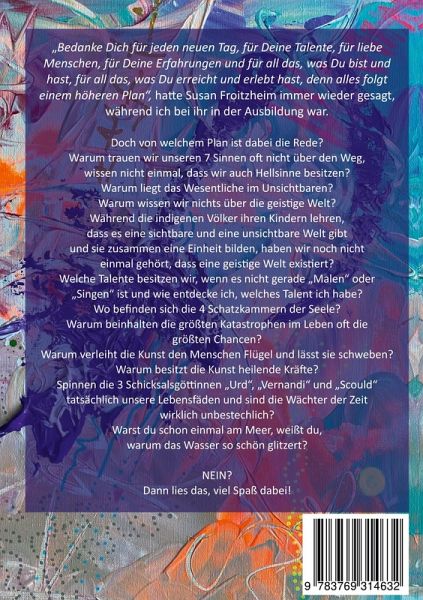 "Bedanke Dich für jeden neuen Tag, für Deine Talente, für liebe Menschen, für Deine Erfahrungen und für all das, was Du bist und hast, für all das, was Du erreicht und erlebt hast, denn alles folgt einem höheren Plan", hatte Susan Froitzheim immer wieder gesagt, während ich bei ihr in der Ausbildung war. Doch von welchem Plan ist dabei die Rede? Warum trauen wir unseren 7 Sinnen oft nicht über den Weg, wissen nicht einmal, dass wir auch Hellsinne besitzen? Warum liegt das Wesentliche im Unsichtbaren? Warum wissen wir nichts über die geistige Welt? Während die indigenen Völker ihren Kindern lehren, dass es eine sichtbare und eine unsichtbare Welt gibt und sie zusammen eine Einheit bilden, haben wir noch nicht einmal gehört, dass eine geistige Welt existiert? Welche Talente besitzen wir, wenn es nicht gerade "Malen" oder "Singen" ist und wie entdecke ich, welches Talent ich habe? Wo befinden sich die 4 Schatzkammern der Seele? Warum beinhalten die größten Katastrophen im Leben oft die größten Chancen? Warum verleiht die Kunst den Menschen Flügel und lässt sie schweben? Warum besitzt die Kunst heilende Kräfte? Spinnen die 3 Schicksalsgöttinnen "Urd", "Vernandi" und "Scould" tatsächlich unsere Lebensfäden und sind die Wächter der Zeit wirklich unbestechlich? Warst du schon einmal am Meer, weißt du warum das Wasser so schön glitzert? NEIN? Dann lies das, viel Spaß dabei!