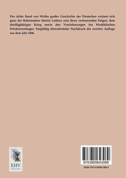 Der dritte Band von Wirths großer Geschichte der Deutschen widmet sich ganz der Reformation Martin Luthers und ihren verheerenden Folgen, dem dreißigjährigen Krieg sowie den Vereinbarungen des Westfälischen Friedensvertrages. Sorgfältig überarbeiteter Nachdruck der zweiten Auflage aus dem Jahr 1846.