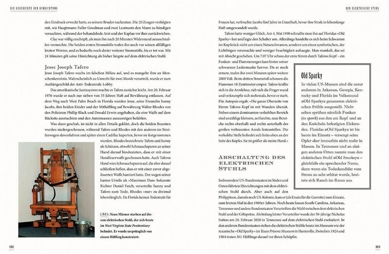 Das Römische Reich ließ Verbrecher vor vollen Zuschauer rängen von Raubtieren zerfleischen oder ans Kreuz schlagen, das Mittelalter bevorzugte es, Delinquen ten aufs Rad zu flechten, bei lebendigem Leib zu kochen, zu vierteilen, zu ertränken oder zu pfählen. Mit der begin nenden Neuzeit kam das Hängen in Mode, bevor die Fran zösische Revolution die Guillotine entdeckte. Erst die Möglichkeiten des 20. Jahr hunderts sorgten für die Einführung des elektrischen Stuhls, der Gaskammer und der Giftspritze. Das Buch, das diese Geschichte der Hinrichtung darstellt und mit schaurigen Bildern illustriert, geht auch kuriosen Aspekten nach - so etwa der Frage, wie lange abgeschlagene Köpfe noch irgendwelche Reaktionen zeigen. Anekdotische Begebenheiten wie die des Scharf richters, der vom Schafott stürzte, als er seinem Publikum das Haupt des Delinquenten präsentieren wollte, runden die Geschichte der Hinrichtung ab - eine Geschichte nicht für schwache Nerven.
