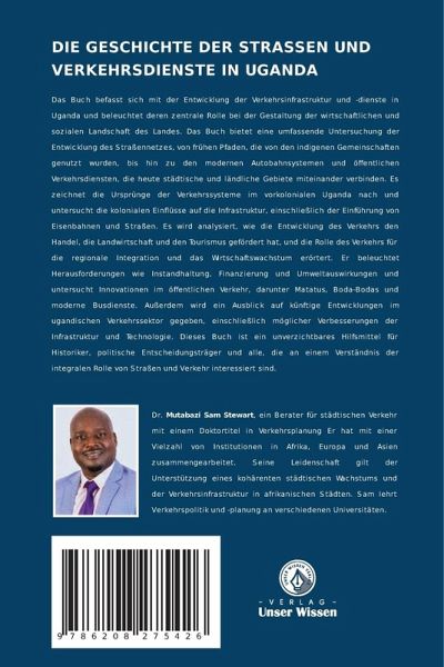 Das Buch befasst sich mit der Entwicklung der Verkehrsinfrastruktur und -dienste in Uganda und beleuchtet deren zentrale Rolle bei der Gestaltung der wirtschaftlichen und sozialen Landschaft des Landes. Das Buch bietet eine umfassende Untersuchung der Entwicklung des Straßennetzes, von frühen Pfaden, die von den indigenen Gemeinschaften genutzt wurden, bis hin zu den modernen Autobahnsystemen und öffentlichen Verkehrsdiensten, die heute städtische und ländliche Gebiete miteinander verbinden. Es zeichnet die Ursprünge der Verkehrssysteme im vorkolonialen Uganda nach und untersucht die kolonialen Einflüsse auf die Infrastruktur, einschließlich der Einführung von Eisenbahnen und Straßen. Es wird analysiert, wie die Entwicklung des Verkehrs den Handel, die Landwirtschaft und den Tourismus gefördert hat, und die Rolle des Verkehrs für die regionale Integration und das Wirtschaftswachstum erörtert. Er beleuchtet Herausforderungen wie Instandhaltung, Finanzierung und Umweltauswirkungen und untersucht Innovationen im öffentlichen Verkehr, darunter Matatus, Boda-Bodas und moderne Busdienste. Außerdem wird ein Ausblick auf künftige Entwicklungen im ugandischen Verkehrssektor gegeben, einschließlich möglicher Verbesserungen der Infrastruktur und Technologie. Dieses Buch ist ein unverzichtbares Hilfsmittel für Historiker, politische Entscheidungsträger und alle, die an einem Verständnis der integralen Rolle von Straßen und Verkehr interessiert sind.