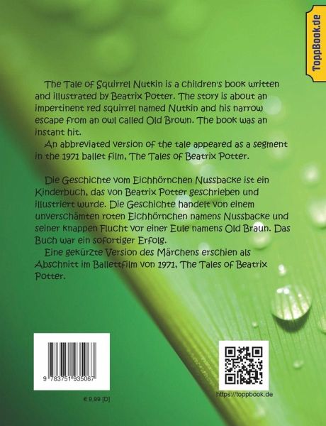 The Tale of Squirrel Nutkin is a children's book written and illustrated by Beatrix Potter. The story is about an impertinent red squirrel named Nutkin and his narrow escape from an owl called Old Brown. The book was an instant hit.An abbreviated version of the tale appeared as a segment in the 1971 ballet film, The Tales of Beatrix Potter. Die Geschichte vom Eichhörnchen Nussbacke ist ein Kinderbuch, das von Beatrix Potter geschrieben und illustriert wurde. Die Geschichte handelt von einem unverschämten roten Eichhörnchen namens Nussbacke und seiner knappen Flucht vor einer Eule namens Old Braun. Das Buch war ein sofortiger Erfolg.Eine gekürzte Version des Märchens erschien als Abschnitt im Ballettfilm von 1971, The Tales of Beatrix Potter.