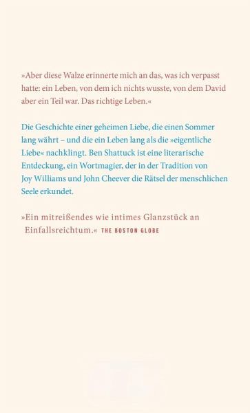 Ben Shattuck über eine geheime Liebe, die Jahrzehnte später wieder zum Klingen kommt - verfilmt mit Paul Mescal and Josh O'ConnorDie Geschichte einer geheimen Liebe, die einen Sommer lang währt - und die ein Leben lang als die »eigentliche Liebe« nachklingt: Im Schatten des Ersten Weltkriegs lernen sich Lionel und David, zwei Musikstudenten, in einer verrauchten Bar im ländlichen Maine kennen und werden Freunde. Nach dem Krieg wandern sie im Sommer durch die Wälder New Englands, um Volkslieder zu sammeln, die sie auf Wachszylinder aufnehmen. Aus unerklärlichen Gründen bricht der Kontakt ab. Als Jahrzehnte später eine Frau beim Aufräumen eines Dachbodens die Wachszylinder findet, erklingt ihre Liebe noch einmal aufs Neue. Ben Shattuck ist eine literarische Entdeckung - ein Wortmagier, der in der Tradition von Joy Williams und John Cheever die Rätsel der menschlichen Seele erkundet.