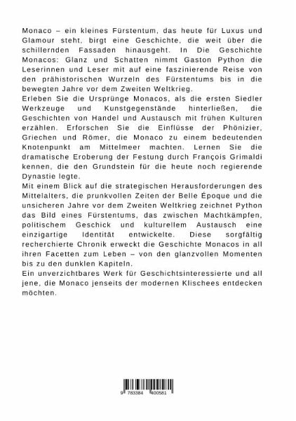 Monaco - ein kleines Fürstentum, das heute für Luxus und Glamour steht, birgt eine Geschichte, die weit über die schillernden Fassaden hinausgeht. In Die Geschichte Monacos: Glanz und Schatten nimmt Gaston Python die Leserinnen und Leser mit auf eine faszinierende Reise von den prähistorischen Wurzeln des Fürstentums bis in die bewegten Jahre vor dem Zweiten Weltkrieg.Erleben Sie die Ursprünge Monacos, als die ersten Siedler Werkzeuge und Kunstgegenstände hinterließen, die Geschichten von Handel und Austausch mit frühen Kulturen erzählen. Erforschen Sie die Einflüsse der Phönizier, Griechen und Römer, die Monaco zu einem bedeutenden Knotenpunkt am Mittelmeer machten. Lernen Sie die dramatische Eroberung der Festung durch François Grimaldi kennen, die den Grundstein für die heute noch regierende Dynastie legte.Mit einem Blick auf die strategischen Herausforderungen des Mittelalters, die prunkvollen Zeiten der Belle Époque und die unsicheren Jahre vor dem Zweiten Weltkrieg zeichnetPython das Bild eines Fürstentums, das zwischen Machtkämpfen, politischem Geschick und kulturellem Austausch eine einzigartige Identität entwickelte. Diese sorgfältig recherchierte Chronik erweckt die Geschichte Monacos in all ihren Facetten zum Leben - von den glanzvollen Momenten bis zu den dunklen Kapiteln.Ein unverzichtbares Werk für Geschichtsinteressierte und all jene, die Monaco jenseits der modernen Klischees entdecken möchten.