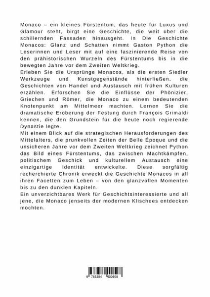 Monaco - ein kleines Fürstentum, das heute für Luxus und Glamour steht, birgt eine Geschichte, die weit über die schillernden Fassaden hinausgeht. In Die Geschichte Monacos: Glanz und Schatten nimmt Gaston Python die Leserinnen und Leser mit auf eine faszinierende Reise von den prähistorischen Wurzeln des Fürstentums bis in die bewegten Jahre vor dem Zweiten Weltkrieg.Erleben Sie die Ursprünge Monacos, als die ersten Siedler Werkzeuge und Kunstgegenstände hinterließen, die Geschichten von Handel und Austausch mit frühen Kulturen erzählen. Erforschen Sie die Einflüsse der Phönizier, Griechen und Römer, die Monaco zu einem bedeutenden Knotenpunkt am Mittelmeer machten. Lernen Sie die dramatische Eroberung der Festung durch François Grimaldi kennen, die den Grundstein für die heute noch regierende Dynastie legte.Mit einem Blick auf die strategischen Herausforderungen des Mittelalters, die prunkvollen Zeiten der Belle Époque und die unsicheren Jahre vor dem Zweiten Weltkrieg zeichnetPython das Bild eines Fürstentums, das zwischen Machtkämpfen, politischem Geschick und kulturellem Austausch eine einzigartige Identität entwickelte. Diese sorgfältig recherchierte Chronik erweckt die Geschichte Monacos in all ihren Facetten zum Leben - von den glanzvollen Momenten bis zu den dunklen Kapiteln.Ein unverzichtbares Werk für Geschichtsinteressierte und all jene, die Monaco jenseits der modernen Klischees entdecken möchten.