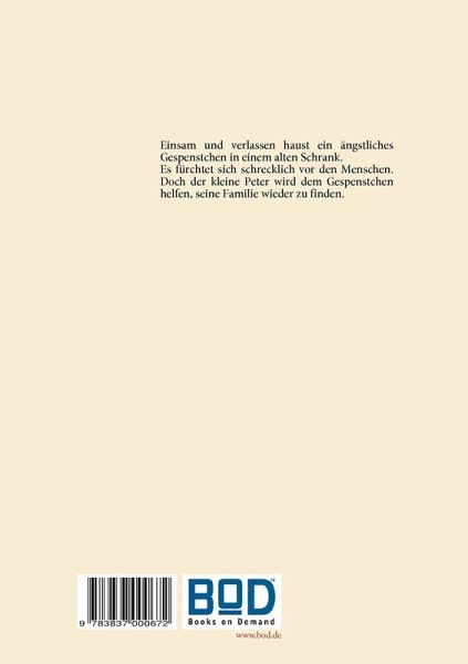 Ein kleines einsames Gespenst lebt schon schrecklich viele Jahre in einem alten Schrank.Herausgekommen ist es schon lange nicht mehr, denn es hat grosse Angst vor den Menschen.Eines Tages aber lernt es Peter kennen........