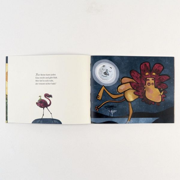 Der Löwen kann nicht einschlafen und wen er auch fragt, der Schlaf möchte sich nicht einstellen. Ganz natürlich versucht der Löwe in den Schlafpositionen von Giraffe, Flamingo, Maus oder
