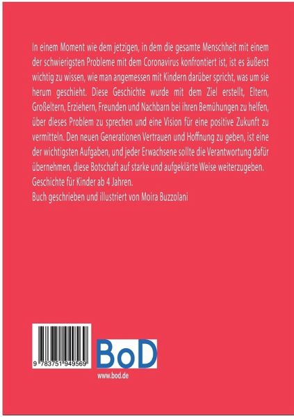 In einem Moment wie dem jetzigen, in dem die gesamte Menschheit mit einem der schwierigsten Probleme mit dem Coronavirus konfrontiert ist, ist es äußerst wichtig zu wissen, wie man angemessen mit Kindern darüber spricht, was um sie herum geschieht. Diese Geschichte wurde mit dem Ziel erstellt, Eltern, Großeltern, Erziehern, Freunden und Nachbarn bei ihren Bemühungen zu helfen, über dieses Problem zu sprechen und eine Vision für eine positive Zukunft zu vermitteln. Den neuen Generationen Vertrauen und Hoffnung zu geben, ist eine der wichtigsten Aufgaben, und jeder Erwachsene sollte die Verantwortung dafür übernehmen, diese Botschaft auf starke und aufgeklärte Weise weiterzugeben.Geschichte für Kinder ab 4 Jahren.Buch geschrieben und illustriert von Moira Buzzolani