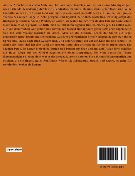 Als die Mönche zum ersten Male am Odhinsstrande landeten, war es das vierunddreißigste Jahr nach Eislands Besiedelung durch die »Landnahmemänner«. Damals stand keine Halle und keine Erdhütte, in der nicht Glums Lied von Hjörleif Zwölfkraft erscholl; denn ein Trollbär war großen Viehraubes willen lange in Acht gelegen, und Hjörleif hatte ihm, waffenlos, im Ringkampf das Rückgrat gebrochen. Als die Weißröcke kamen, da wußte Keiner, wer da den Fuß ans Land setzte. Hätte man es aber gewußt, so hätte man sie mit ihren eigenen Rudern erschlagen. Es hatten wohl alle von dem weißen Gott gehört und davon, daß Harald Hårfagr auch große Jarle gezwungen hatte, sich mit dem Wasser waschen zu lassen. Aber als die Mönche, denen der Sturm die Segel genommen hatte, krank und schwankend aus dem gebrechlichen Schiffe stiegen, da gab man ihnen Speise und Trank nach alten Gastgeboten. Und den Anführer, der auf die Knie fiel und schrie: »Ich danke dir, Herr, daß ich dies Land dir erobern darf!« den achteten sie für einen armen Irren. Die Männer baten, im Lande bleiben zu dürfen und bauten aus Erde und aus dem Holze ihres Schiffes ein Haus. Oben auf den Giebel nagelten sie einen Doppelstab, den viele zuerst für Thorrs Hammerzeichen hielten, doch war es das Kreuz, davor sie knieten. Sie nährten sich kümmerlich von Fischen, die sie fingen, gutes Roßfleisch wiesen sie schaudernd zurück und sagten, es gälte für unrein dort, woher sie kämen.