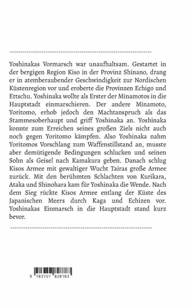 Yoshinakas Vormarsch war unaufhaltsam. Gestartet in der bergigen Region Kiso in der Provinz Shinano, drang er in atemberaubender Geschwindigkeit zur Nordischen Küstenregion vor und eroberte die Provinzen Echigo und Ettschu. Yoshinaka wollte als Erster der Minamotos in die Hauptstadt einmarschieren. Der andere Minamoto, Yoritomo, erhob jedoch den Machtanspruch als das Stammesoberhaupt und griff Yoshinaka an. Yoshinaka konnte zum Erreichen seines großen Ziels nicht auch noch gegen Yoritomo kämpfen. Also Yoshinaka nahm Yoritomos Vorschlang zum Waffenstillstand an, musste aber demütigende…mehr