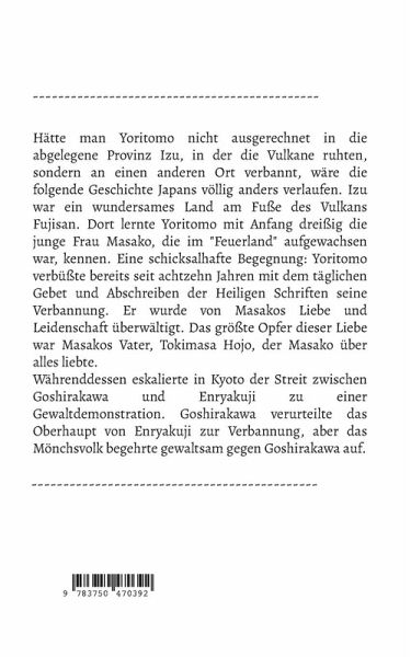 Hätte man Yoritomo nicht ausgerechnet in die abgelegene Provinz Izu, in der die Vulkane ruhten, sondern an einen anderen Ort verbannt, wäre die folgende Geschichte Japans völlig anders verlaufen. Izu war ein wundersames Land am Fuße des Vulkans Fujisan. Dort lernte Yoritomo mit Anfang dreißig die junge Frau Masako, die im "Feuerland" aufgewachsen war, kennen. Eine schicksalhafte Begegnung: Yoritomo verbüßte bereits seit achtzehn Jahren mit dem täglichen Gebet und Abschreiben der Heiligen Schriften seine Verbannung. Er wurde von Masakos Liebe und Leidenschaft überwältigt. Das größte Opfer…mehr