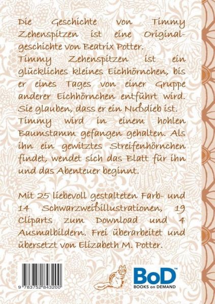 Die Geschichte von Timmy Zehenspitzen ist eine Originalgeschichte von Beatrix Potter. Timmy Zehenspitzen ist ein glückliches kleines Eichhörnchen, bis er eines Tages von einer Gruppe anderer Eichhörnchen entführt wird. Sie glauben, dass er ein Nußdieb ist. Timmy wird in einem hohlen Baumstamm gefangen gehalten. Als ihn ein gewitztes Streifenhörnchen findet, wendet sich das Blatt für ihn und das Abenteuer beginnt.Mit 25 liebevoll gestalteten Farb- und 14 Schwarzweißillustrationen, 19 Cliparts zum Download und 4 Ausmalbildern. Frei überarbeitet und übersetzt von Elizabeth M. Potter.