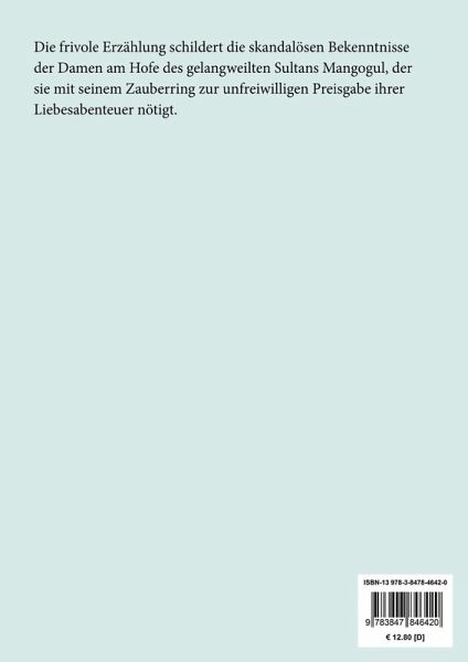 Denis Diderot: Die geschwätzigen Kleinode oder Die Verräter. (Les Bijoux indiscrets) Lesefreundlicher Großdruck in 16-pt-Schrift Die frivole Erzählung schildert die skandalösen Bekenntnisse der Damen am Hofe des gelangweilten Sultans Mangogul, der sie mit seinem Zauberring zur unfreiwilligen Preisgabe ihrer Liebesabenteuer nötigt. Großformat, 210 x 297 mm Berliner Ausgabe, 2020 Durchgesehener Neusatz mit einer Biographie des Autors bearbeitet und eingerichtet von Theodor Borken Erstdruck: Paris 1748. Druck der ersten deutschen Übersetzung von J. B. von Knoll: Augsburg 1776. Textgrundlage ist die Ausgabe: Denis Diderot: Die geschwätzigen Kleinode oder die Verräter, München: Georg Müller, 1921 [Die Bücher der Abtei Thelem, 28. Band]. Umschlaggestaltung von Thomas Schultz-Overhage unter Verwendung des Bildes: Lovis Corinth, Die schwarze Maske, 1908. Gesetzt aus der Minion Pro, 16 pt. Henricus Edition Deutsche Klassik UG (haftungsbeschränkt)