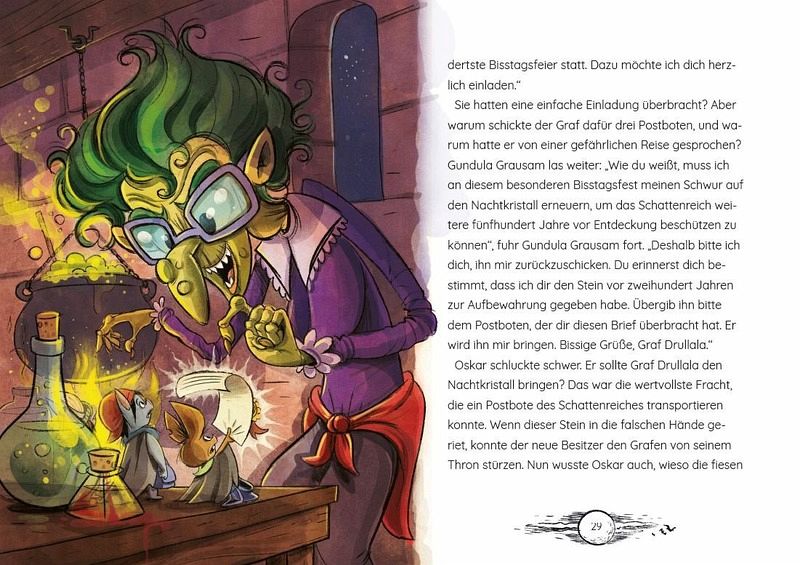 Willkommen im Schattenreich, wo Familie Flederzisch seit Generationen das Postzentrum leitet! Normalerweise geht hier alles seinen geregelten Gang - doch als Graf Drullala ausgerechnet den schüchternen Oskar und seine Geschwister mit einer heiklen Mission betraut, wird es brenzlig. Ihr Auftrag? Einen wertvollen Brief an niemand Geringeren als die gefürchtete Hexe Gundula Grausam zu überbringen!