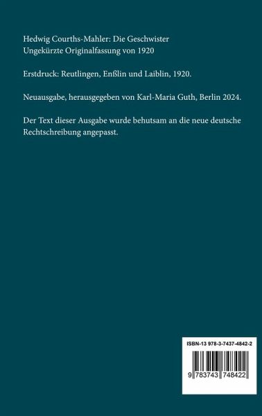 Hedwig Courths-Mahler: Die Geschwister. Ungekürzte Originalfassung von 1920 Erstdruck: Reutlingen, Enßlin und Laiblin, 1920. Neuausgabe, herausgegeben von Karl-Maria Guth, Berlin 2024. Der Text dieser Ausgabe wurde behutsam an die neue deutsche Rechtschreibung angepasst. Umschlagabbildung: Mary Cassatt, Junge Frau im Grünen draußen in der Sonne, um 1914 Gesetzt aus der Minion Pro, 11 pt. Henricus - Edition Deutsche Klassik GmbH
