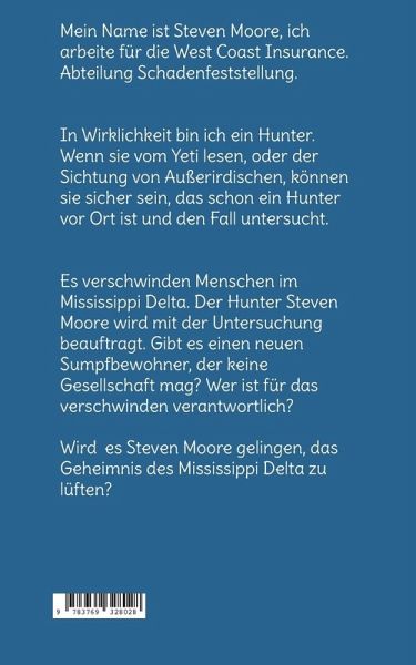 Mein Name ist Steven Moore, ich arbeite für die West Coast Insurance. Abteilung Schadenfeststellung. In Wirklichkeit bin ich ein Hunter. Wenn sie vom Yeti lesen, oder der Sichtung von Außerirdischen, können sie sicher sein, dass schon ein Hunter vor Ort ist und den Fall untersucht. Es verschwinden Menschen im Mississippi-Delta. Der Hunter Steven Moore wird mit der Untersuchung beauftragt. Gibt es einen neuen Sumpfbewohner, der keine Gesellschaft mag? Wer ist für das Verschwinden verantwortlich? Wird es Steven Moore gelingen, das Geheimnis des Mississippi-Delta zu lüften?