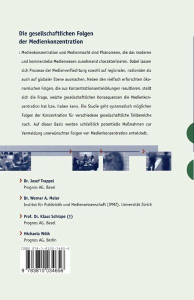 Medienkonzentration und Medienmacht sind Phänomene, die das moderne und kommerzielle Medienwesen zunehmend charakterisieren. Dabei lassen sich Prozesse der Medienverflechtung sowohl auf regionaler, nationaler als auch auf globaler Ebene ausmachen. Neben den vielfach erforschten ökonomischen Folgen, die aus Konzentrationsentwicklungen resultieren, stellt sich die Frage, welche gesellschaftlichen Konsequenzen die Medienkonzentration hat bzw. haben kann. Die Studie geht systematisch möglichen Folgen der Konzentration für verschiedene gesellschaftliche Teilbereiche nach. Auf dieser Basis werden schließlich potentielle Maßnahmen zur Vermeidung unerwünschter Folgen der Medienkonzentration entwickelt.
