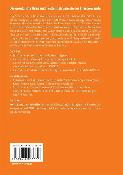Jörg Scheffler stellt die wesentlichen, vor allem technischen Inhalte des Erneuerbare-Energien-Gesetzes und des Kraft-Wärme-Kopplungsgesetzes vor, die Schwerpunkte der gesetzlichen Basis der Energiewende sind. Im Vordergrund stehen dabei neben den Kosten und deren Umlage auch Aspekte der Netzanbindung und des Netzbetriebs. Der Autor bietet damit einen aktuellen Überblick über die seit etwa dem Jahr 2000 in Deutschland stattfindende Umstrukturierung der Elektroenergieversorgung, die in diesem Umfang weltweit einmalig ist. Ein umfangreiches Literaturverzeichnis ermöglicht es, auch künftig schnell auf aktuelle Informationen zugreifen zu können.