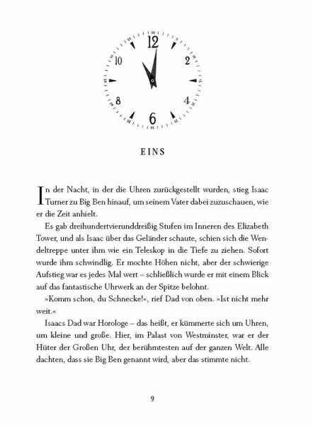 Isaac Turner ist zwölf Jahre alt. Sein Vater ist Uhrmacher in London - und zuständig für eine der berühmtesten Uhren der Welt: Big Ben in Westminster. Als die Uhr für die Sommerzeit zurückgestellt werden soll, verschwindet Isaacs Vater aus dem Glockenturm. Er hinterlässt nichts als seine zerbrochene Taschenuhr und und eine kryptische Nachricht. Auf der Suche nach Hinweisen kommt Isaac einer finsteren Verschwörung aus Regierungskreisen auf die Spur. In einem Wettlauf gegen die Zeit muss er seinen Vater retten ... und sogar die Zeit selbst!
