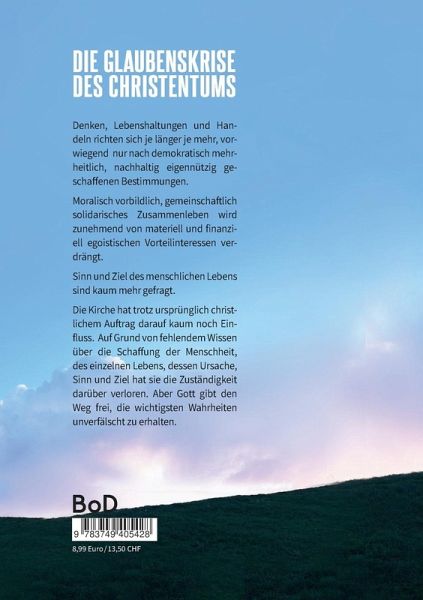 Denken, Lebenshaltungen und Handeln richten sich je länger je mehr, vorwiegend nur nach demokratisch mehrheitlich, nachhaltig eigennützig geschaffenen Bestimmungen. Moralisch vorbildlich, gemeinschaftlich solidarisches Zusammenleben wird zunehmend von materiell und finanziell egoistischen Vorteilinteressen verdrängt. Sinn und Ziel des menschlichen Lebens sind kaum mehr gefragt. Die Kirche hat trotz ursprünglich christlichem Auftrag darauf kaum noch Einfluss. Auf Grund von fehlendem Wissen über die Schaffung der Menschheit, des einzelnen Lebens, dessen Ursache, Sinn und Ziel hat sie die Zuständigkeit darüber verloren. Aber Gott gibt den Weg frei, die wichtigsten Wahrheiten unverfälscht zu erhalten.