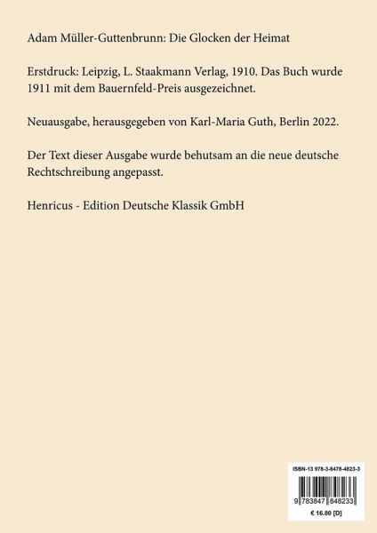 Adam Müller-Guttenbrunn: Die Glocken der HeimatLesefreundlicher Großdruck in 16-pt-SchriftGroßformat, 210 x 297 mmBerliner Ausgabe, 2023Durchgesehener Neusatz bearbeitet und eingerichtet von Theodor BorkenErstdruck: Leipzig, L. Staakmann Verlag, 1910. Das Buch wurde 1911 mit dem Bauernfeld-Preis ausgezeichnet.Der Text dieser Ausgabe wurde behutsam an die neue deutsche Rechtschreibung angepasst.Gesetzt aus der Minion Pro, 16 pt.Henricus - Edition Deutsche Klassik GmbH