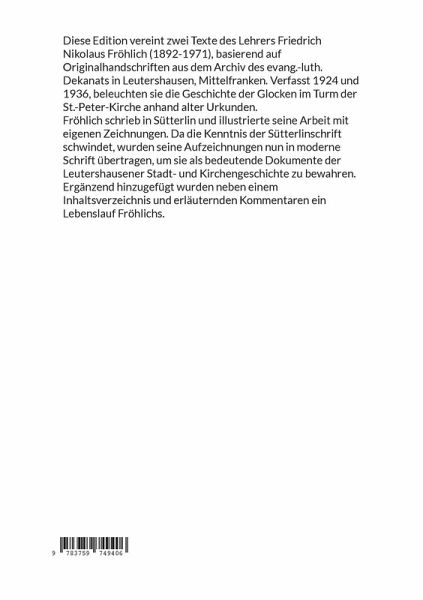 Diese Edition vereint zwei Texte des Lehrers Friedrich Nikolaus Fröhlich (1892-1971), basierend auf seinen Originalhandschriften aus dem Archiv des evang.-luth. Dekanats in Leutershausen, Mittelfranken. Verfasst 1924 und 1936, beleuchten sie die Geschichte der Glocken im Turm der St.-Peter-Kirche anhand alter Urkunden.Fröhlich schrieb in Sütterlin und illustrierte seine Arbeit mit eigenen Zeichnungen. Da die Kenntnis der Sütterlinschrift schwindet, wurden seine Aufzeichnungen nun in moderne Schrift übertragen, um sie als bedeutende Dokumente der Leutershausener Stadt- und Kirchengeschichte zu bewahren.Ergänzend hinzugefügt wurden neben einem Inhaltsverzeichnis und erläuternden Kommentaren ein Lebenslauf Fröhlichs.