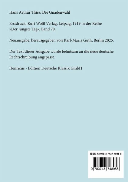 Hans Arthur Thies: Die Gnadenwahl Erstdruck: Kurt Wolff Verlag, Leipzig, 1919 in der Reihe »Der Jüngste Tag«, Band 70. Neuausgabe, herausgegeben von Karl-Maria Guth, Berlin 2025. Der Text dieser Ausgabe wurde behutsam an die neue deutsche Rechtschreibung angepasst. Gesetzt aus der Minion Pro, 11.3 pt. Henricus - Edition Deutsche Klassik GmbH