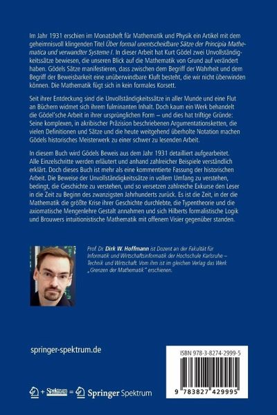 In diesem Buch wird Gödels Beweis aus dem Jahr 1931 detailliert aufgearbeitet. Alle Einzelschritte werden erläutert und anhand zahlreicher Beispiele verständlich erklärt. Doch dieses Buch ist mehr als eine kommentierte Fassung der historischen Arbeit. Die Beweise der Unvollständigkeitssätze in vollem Umfang zu verstehen, bedingt, die Geschichte zu verstehen, und so versetzen zahlreiche Exkurse den Leser in die Zeit zu Beginn des zwanzigsten Jahrhunderts zurück. Es ist die Zeit, in der die Mathematik die größte Krise ihrer Geschichte durchlebte, die Typentheorie und die axiomatische Mengenlehre Gestalt annahmen und sich Hilberts formalistische Logik und Brouwers intuitionistische Mathematik mit offenem Visier gegenüber standen.