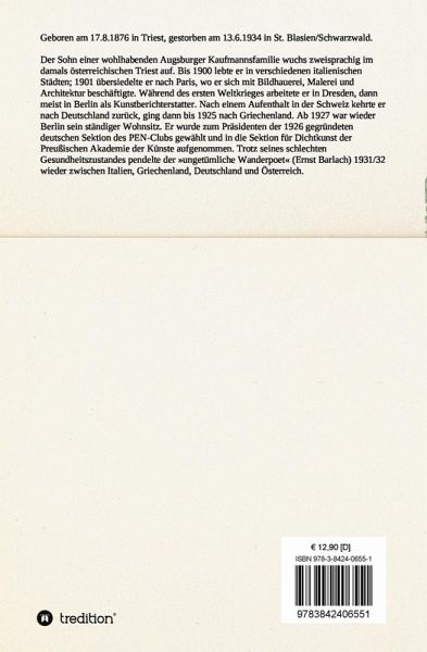 Geboren am 17.8.1876 in Triest, gestorben am 13.6.1934 in St. Blasien/Schwarzwald. Der Sohn einer wohlhabenden Augsburger Kaufmannsfamilie wuchs zweisprachig im damals österreichischen Triest auf. Bis 1900 lebte er in verschiedenen italienischen Städten; 1901 übersiedelte er nach Paris, wo er sich mit Bildhauerei, Malerei und Architektur beschäftigte. Während des ersten Weltkrieges arbeitete er in Dresden, dann meist in Berlin als Kunstberichterstatter. Nach einem Aufenthalt in der Schweiz kehrte er nach Deutschland zurück, ging dann bis 1925 nach Griechenland. Ab 1927 war wieder Berlin sein ständiger Wohnsitz. Er wurde zum Präsidenten der 1926 gegründeten deutschen Sektion des PEN-Clubs gewählt und in die Sektion für Dichtkunst der Preußischen Akademie der Künste aufgenommen. Trotz seines schlechten Gesundheitszustandes pendelte der »ungetümliche Wanderpoet« (Ernst Barlach) 1931/32 wieder zwischen Italien, Griechenland, Deutschland und Österreich.