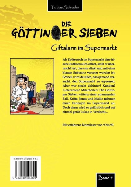 Als Kröte noch im Supermarkt eine frische Erdbeermilch öffnet, stellt er überrascht fest, dass sie stinkt und mit einer blauen Substanz versetzt worden ist. Schnell wird deutlich, dass jemand versucht, den Supermarkt zu erpressen. Aber wer steckt dahinter? Kunden? Lieferanten? Mitarbeiter? Die Göttinger Sieben wittern einen spannenden Fall. Kröte, Jonas und Maike nehmen einen Ferienjob im Supermarkt an. Doch dann wird es gefährlich und aufeinmal gerät Lukas in Verdacht...