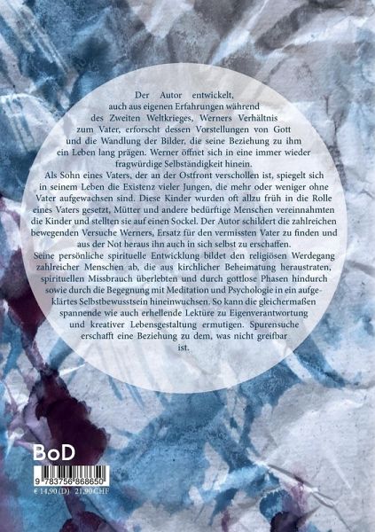 Der Autor entwickelt aus den Erfahrungen der Kindheit während des Zweiten Weltkrieges sein Verhältnis zum Vater, erforscht seine Vorstellungen von Gott und die Wandlung der Bilder, die seine Beziehung zu ihm ein Leben lang prägen. Er öffnet sich in eine immer wieder fragwürdige Selbständigkeit hinein.Als Sohn eines Vaters, der an der Ostfront verschollen ist, spiegelt sich in seinem Leben die Existenz vieler Jungen, die mehr oder weniger ohne Vater aufgewachsen sind. Diese Kinder wurden oft allzu früh in die Rolle eines Vaters gesetzt, Mütter und andere bedürftige Menschen vereinnahmten die Kinder und stellten sie auf einen Sockel. Der Autor schildert die zahlreichen bewegenden Versuche, Ersatz für den vermissten Vater zu finden und aus der Not heraus ihn auch in sich selbst zu erschaffen.Seine persönliche spirituelle Entwicklung bildet den religiösen Werdegang zahlreicher Menschen ab, die aus kirchlicher Beheimatung heraustraten, spirituellen Missbrauch überlebten und durch gottlose Phasen hindurch sowie durch die Begegnung mit Meditation und der Psychologie in ein aufgeklärtes Selbstbewusstsein hineinwuchsen. So kann die gleichermaßen spannende wie auch erhellende Lektüre zu Eigenverantwortung und kreativer Lebensgestaltung ermutigen. Spurensuche erschafft eine Beziehung zu dem, was nicht greifbar ist.
