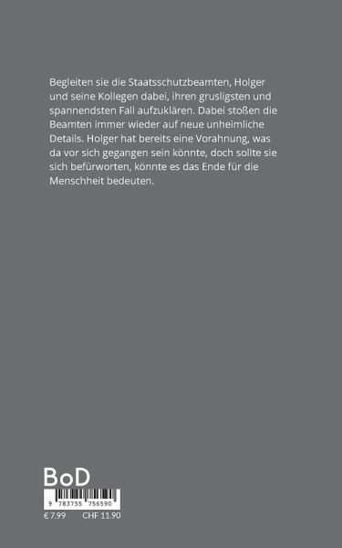 Begleiten sie die Staatsschutzbeamten Holger und seine Kollegen dabei, ihren grusligsten und spannendsten Fall aufzuklären. Dabei stoßen die Beamten immer wieder auf neue unheimliche Details. Holger hat bereits eine Vorahnung, was da vor sich gegangen sein könnte, doch sollte sie sich bewahrheiten, könnte es das Ende für die Menschheit bedeuten.