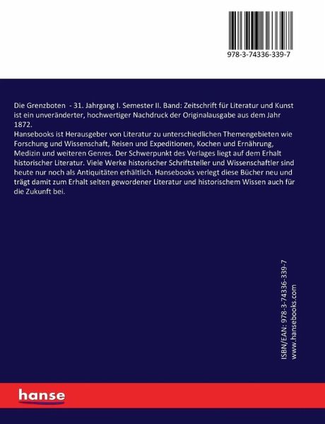 Die Grenzboten - 31. Jahrgang I. Semester II. Band: Zeitschrift für Literatur und Kunst ist ein unveränderter, hochwertiger Nachdruck der Originalausgabe aus dem Jahr 1872.