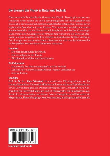 Dieses essential beschreibt die Grenzen der Physik. Davon gibt es zwei verschiedene Arten: solche, die durch die Grundgesetze der Physik gegeben sind und solche, die unseren technischen Möglichkeiten entsprechen. Jenseits davon beginnt der Bereich des Science Fiction. Wir betrachten zunächst die beiden Standardmodelle, das der Elementarteilchenphysik und das der Kosmologie. Dann werden die Grundgesetze der Physik besprochen und die Bereiche abgesteckt, in denen sie gelten. Für die wichtigsten physikalischen Größen wie Raum, Zeit, Energie usw. werden die Skalen diskutiert, die sich von den kleinsten bis zu den größten Werten dieser Parameter erstrecken.