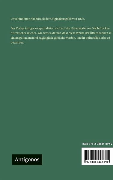 Unveränderter Nachdruck der Originalausgabe von 1873. Der Verlag Antigonos spezialisiert sich auf die Herausgabe von Nachdrucken historischer Bücher. Wir achten darauf, dass diese Werke der Öffentlichkeit in einem guten Zustand zugänglich gemacht werden, um ihr kulturelles Erbe zu bewahren.